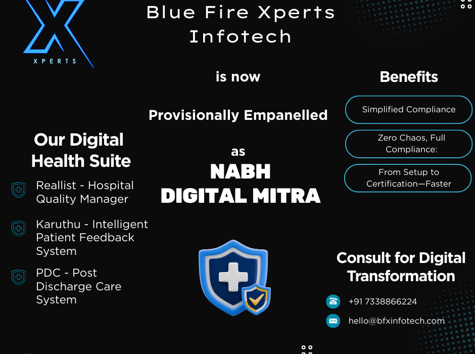 🎉 A Proud Milestone in Healthcare Digital Transformation We are excited to announce that Blue Fire Xperts Infotech OPC Pvt. Ltd. has been officially empanelled as a NABH Digital Mitra by the National Accreditation Board for Hospitals & Healthcare Providers (NABH). This recognition marks a significant step in our mission [...]